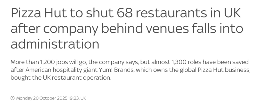 ●必胜客背后公司进入破产管理,将关闭在英国的68家餐厅