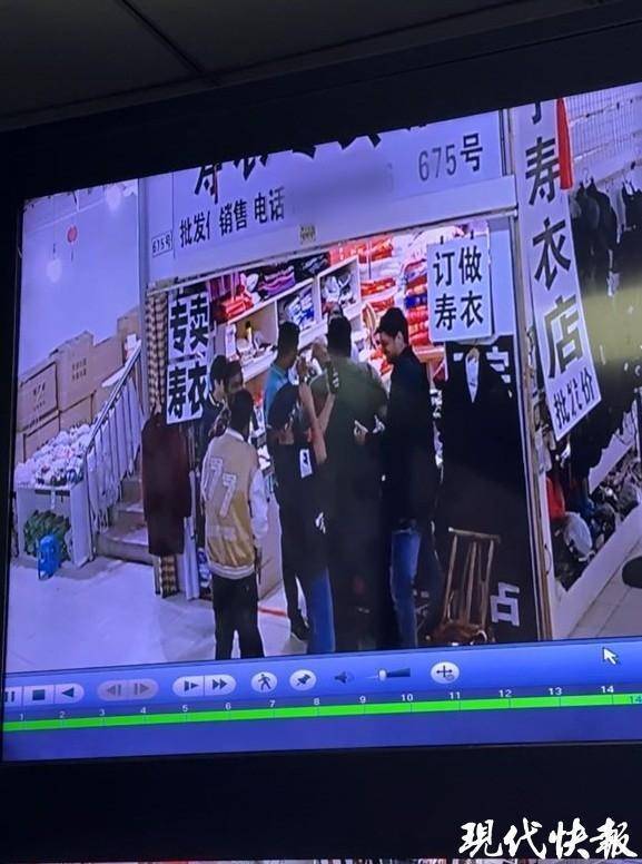 在该市场管理处,现代快报记者看到一处正对着寿衣店的公共视频。根据视频显示,当天,外国人一行来到摊位后,径直拿起帽子试戴了起来,并未进入店内试穿寿衣。从进入店内到离开,整个过程在七八分钟。