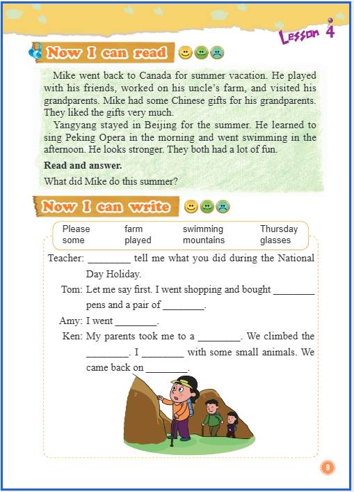- 10 分钟阅读写作:读 1 篇短文(100 词内),回答 2 个问题(如 “What did the girl do?”);再用短文里的句型写 3-5 句(如模仿写自己的周末)。