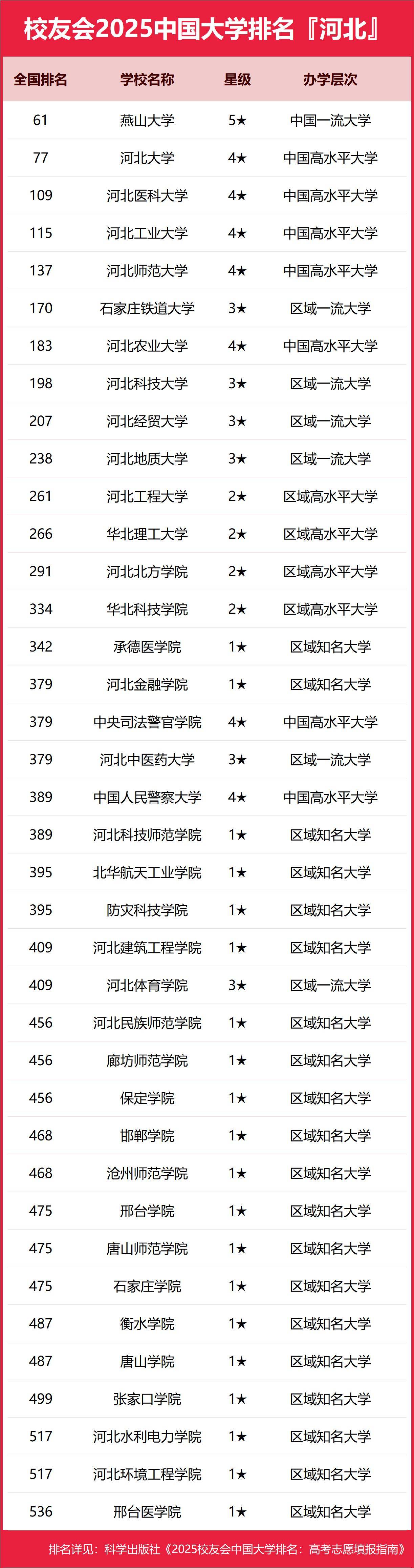 2025校友会中国大学排名重磅出炉,河北省高等教育格局呈现稳中有变的态势。燕山大学稳居全省榜首,以5星级评价蝉联"中国一流大学"称号;河北大学以深厚文理底蕴位列全国77位,"研究型大学"建设成效显著;石家庄铁道大学依托交通特色强势挺进全国前200强。医学类院校表现亮眼,河北医科大学凭借临床医学博士后流动站等优势稳坐医学类榜首,其附属医院科研转化能力持续领跑华北地区。教育类院校中,河北师范大学师范专业认证通过率保持100%,为京津冀输送大批基础教育人才。值得关注的是,河北经贸大学现代商贸学科群、河北地质大学资源勘查工程等特色专业,均形成独具竞争力的办学优势。