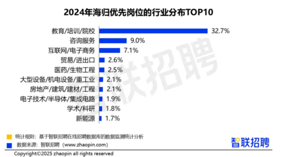 根据智联招聘发布的《2024中国留学生归国求职洞察报告》显示,教育/培训/院校是海归优先选,甚至超过了互联网、咨询等热门行业。