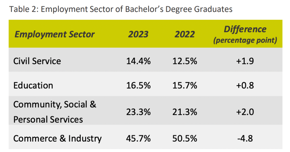 根据香港大学2023年就业调研数据,3065名本科毕业生中有16.5%进入教育行业,这是第三大就业方向,并且呈现逐年上升趋势。