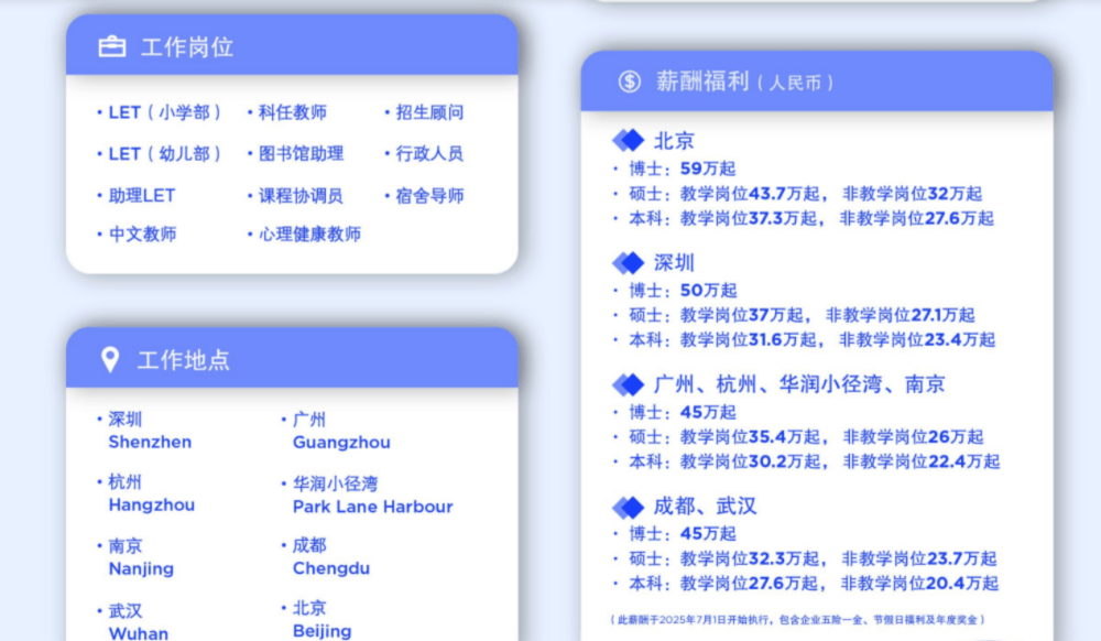该校今年不仅招收各类学科教师,还有行政人员、助理、招生顾问,宿舍导师等等,开出的报酬极为诱人,本科年薪20多万起,博士甚至能达到59万元以上。