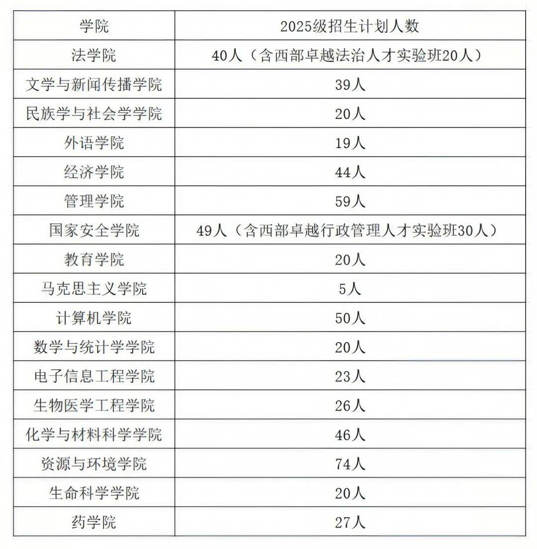 5、合理制定招生计划。根据《中南民族大学学科专业转型升级与调整优化改革实施方案》的通知精神,结合专业的教学条件、就业升学以及往年转专业报名情况,由各学院制定招生计划。在2025级招生计划总人数(见下表)不变的情况下,各学院可在本单位内调配招生计划,但各专业(大类)招生计划名额原则上不低于专业(大类)学生人数的5%。2024级各专业(大类)招生计划由学院根据实际情况研究决定。