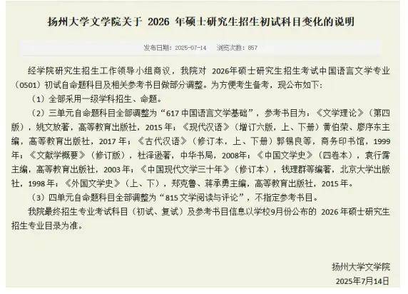 扬州大学文学院关于2026年硕士研究生招生初试科目变化的说明