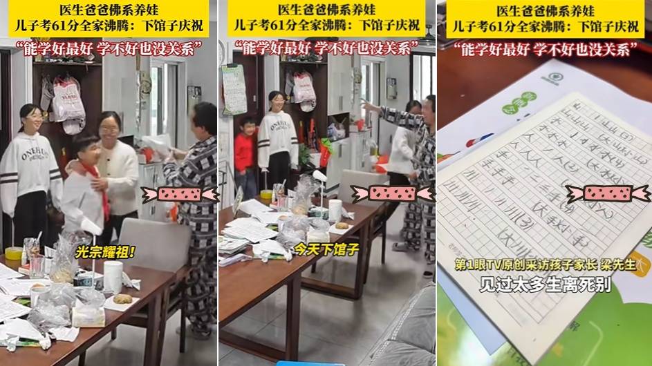 爸爸妈妈不但没骂孩子成绩差,而且还抓住了孩子61分的进步,为孩子欢呼喝彩!