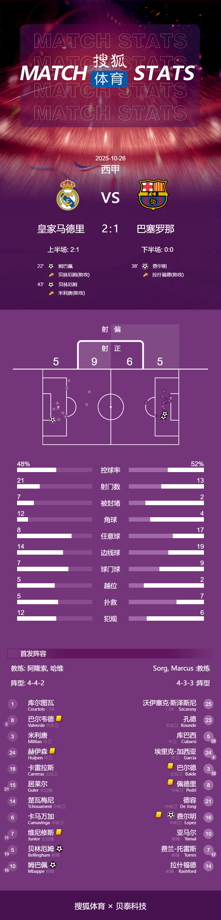 2025年10月26日23点15分,2025-2026赛季西甲联赛第10轮迎来万众瞩目的西班牙国家德比,皇马坐镇主场对阵巴塞罗那。上半场,姆巴佩破门,不过因为越位在先被取消。随后,贝林厄姆直塞,姆巴佩单刀破门。拉什福德助攻,费尔明扳平比分。米利唐头球摆渡,贝林厄姆得分帮助皇马再次领先、下半场,加西亚手球送点,不过姆巴佩主罚的点球被什琴斯尼扑出。终场前,佩德里铲球犯规领导第二张黄牌被罚下。最终,皇马2-1战胜巴萨,结束了此前对巴萨的4连败,此外还在积分榜上将领先优势扩大到5分。