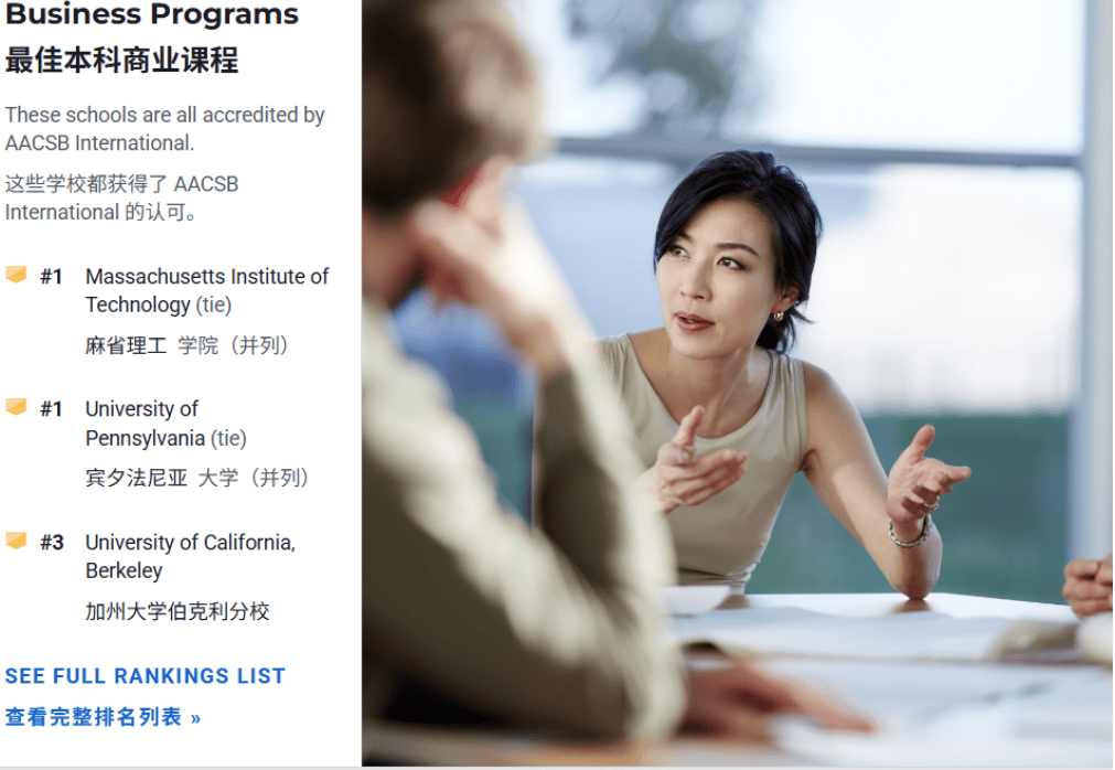 在本科商科榜单中,MIT与宾大并列第一,伯克利位居第三