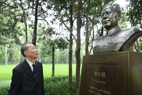 朱九思之子朱毅凝视父亲的雕像。