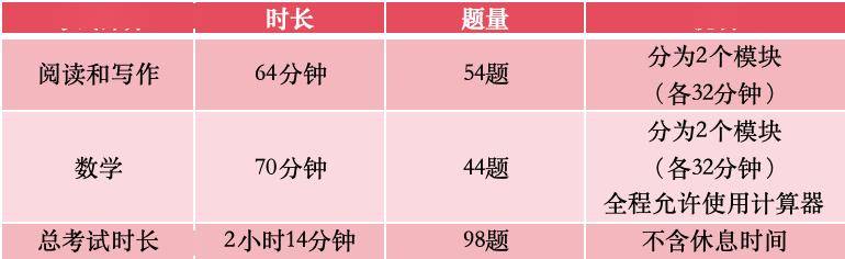 2025年,SAT完成了从纸笔考试到数字化自适应测试的过渡。考试包含阅读和写作、数学2个模块,考试时长压缩至2小时14分钟。