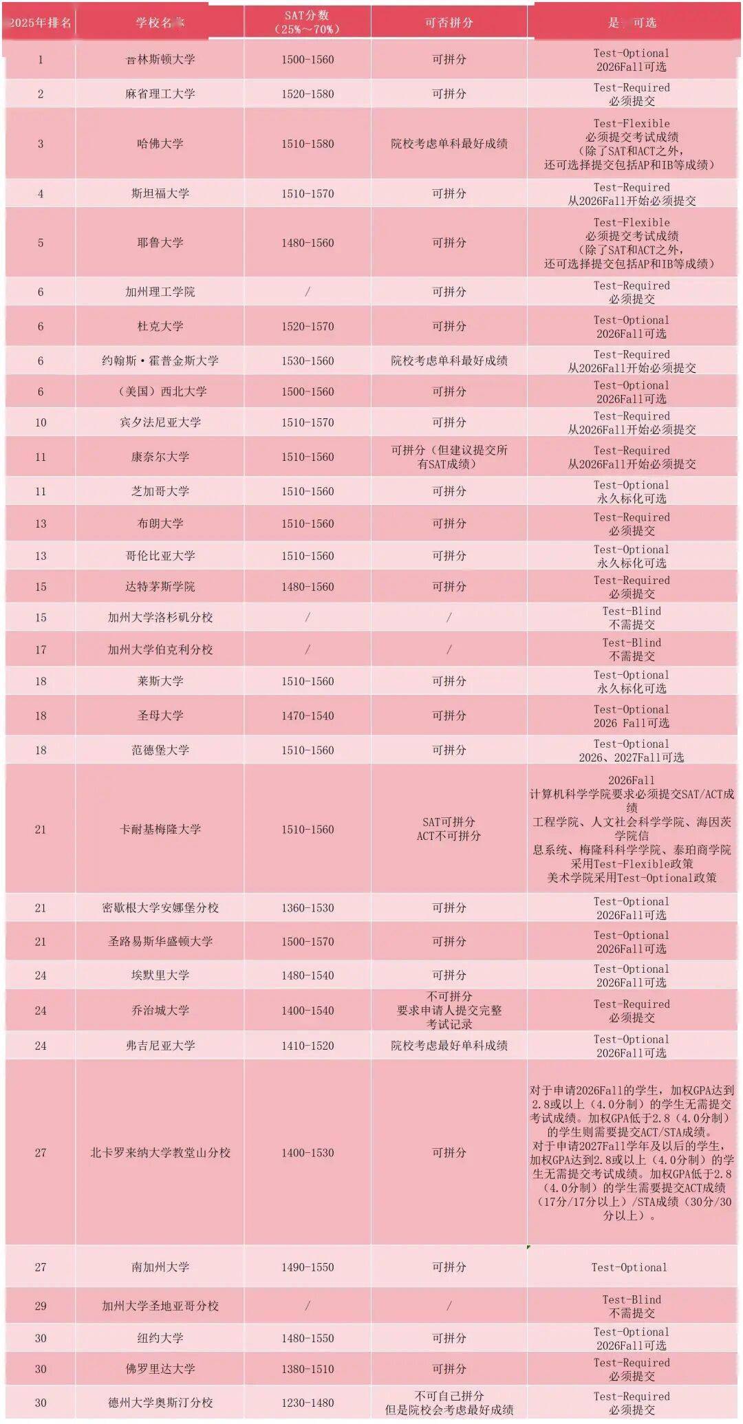 必须提交 SAT 的 “重点校”