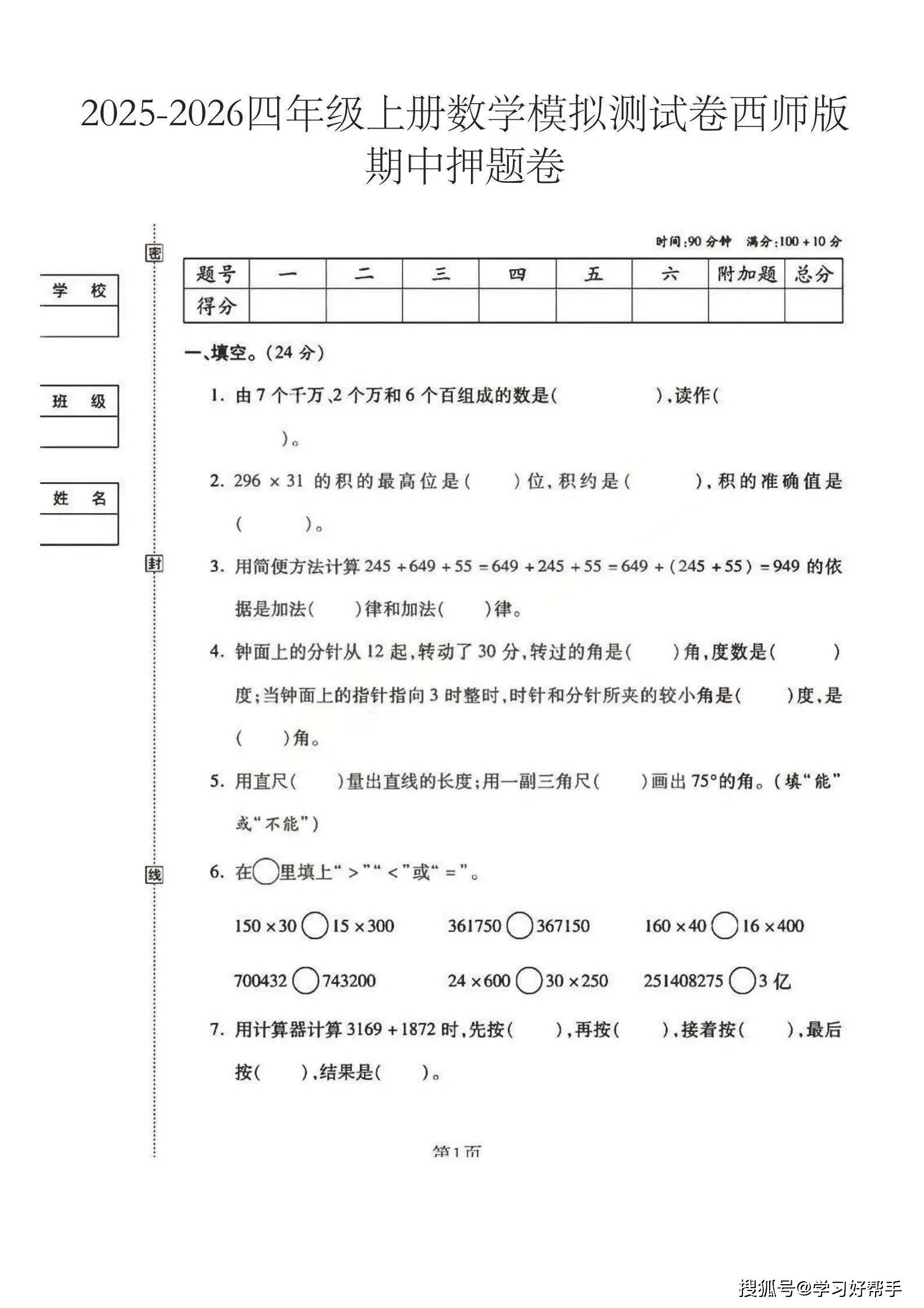 四年级是数学运算精度提升、空间几何认知深化的关键期,2025 秋期中想让孩子精准对接西师大版教材重点、高效突破核心难点?这份四年级上册数学期中模拟测试卷太对症了!复刻期中考试题型与难度梯度,聚焦核心考点系统设计,是期中复习的实用好帮手~