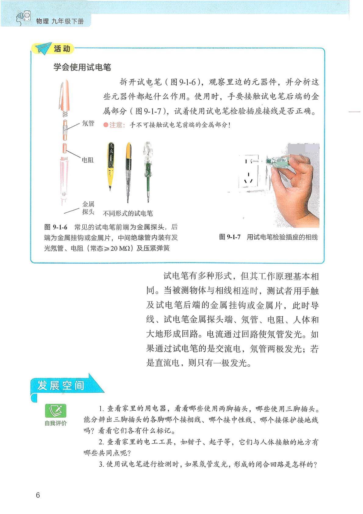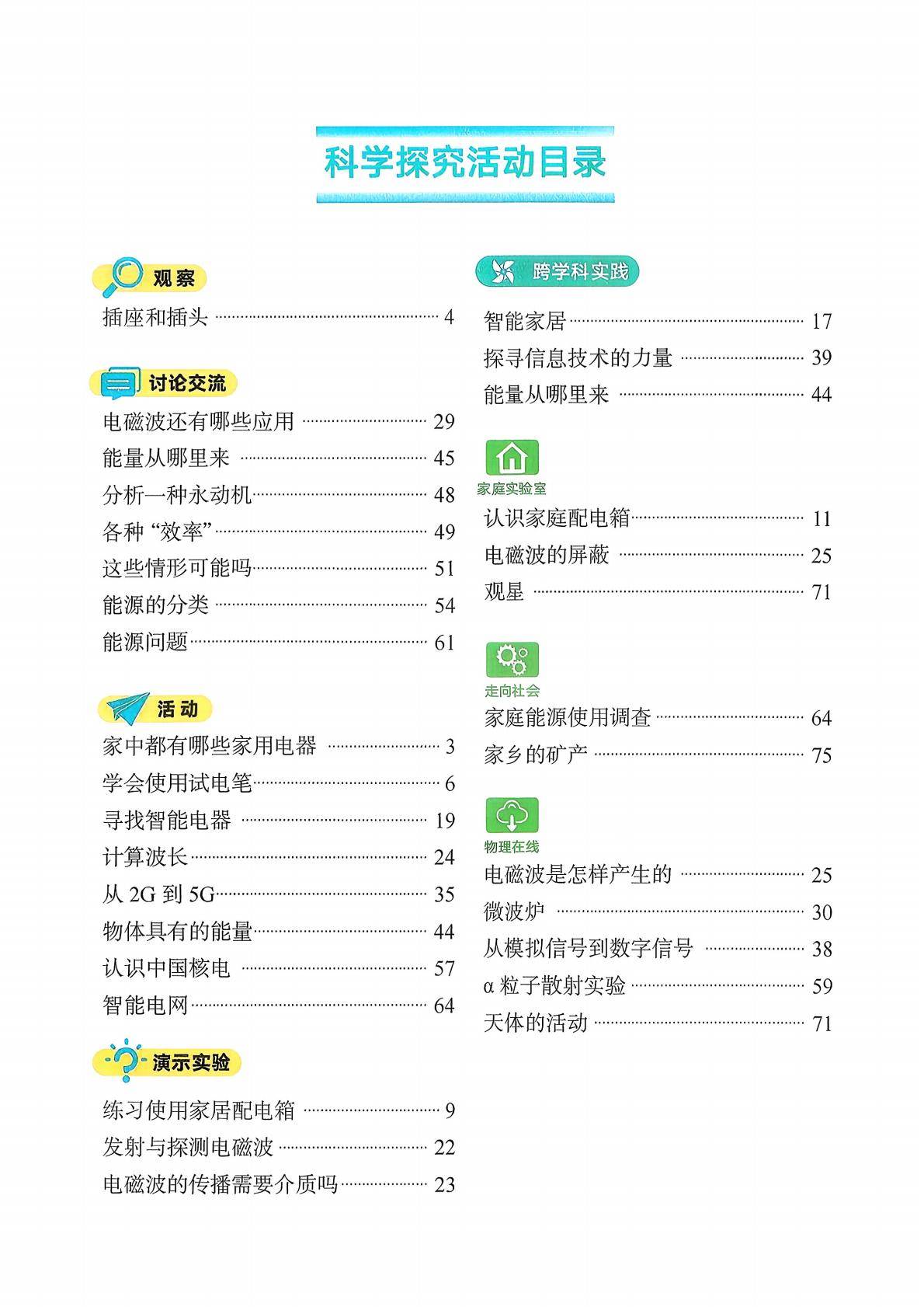 在知识内容上,家庭用电板块详细介绍了家用电器、家庭电路、安全用电等知识,如试电笔的构造与使用原理,让学生掌握家庭用电的基本常识与安全规范;电磁波与信息技术板块讲解了电磁波的产生、应用及信息技术的发展,帮助学生理解现代通信技术的物理原理;能源与可持续发展板块则涉及能量守恒定律、能源分类、核能及能源可持续发展等内容,提升学生的能源认知与环保意识。