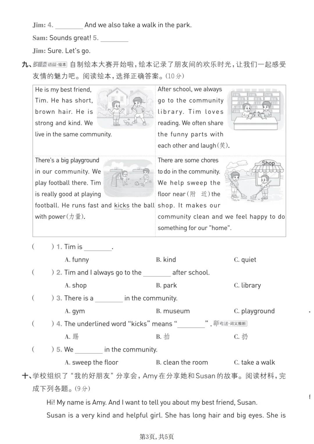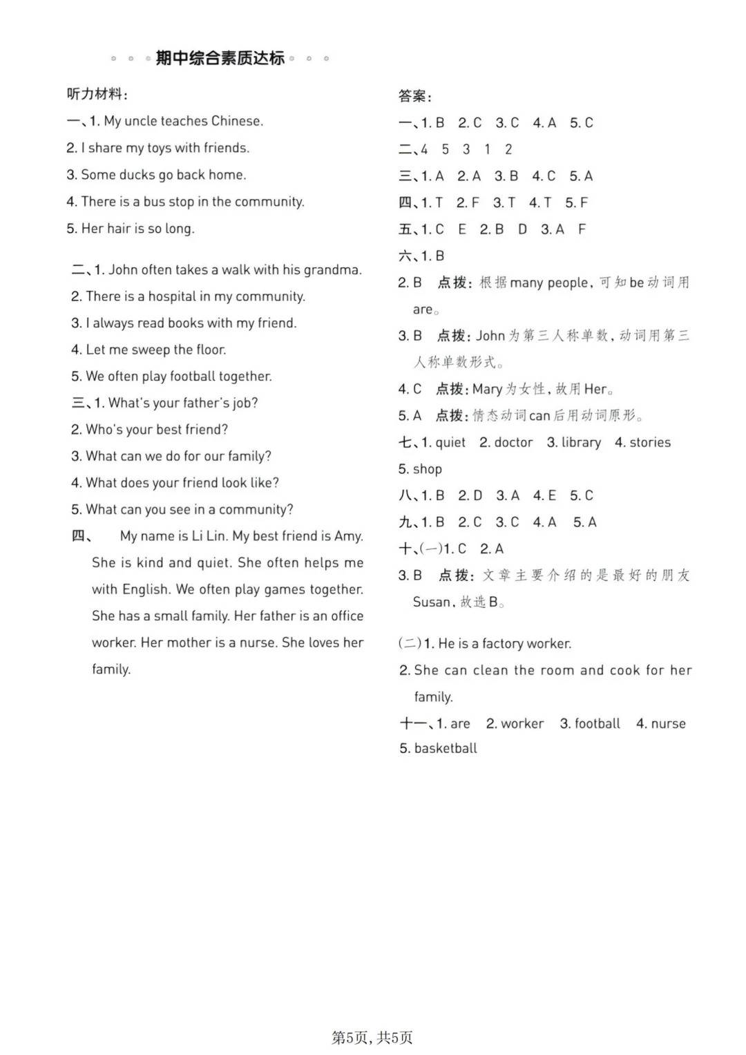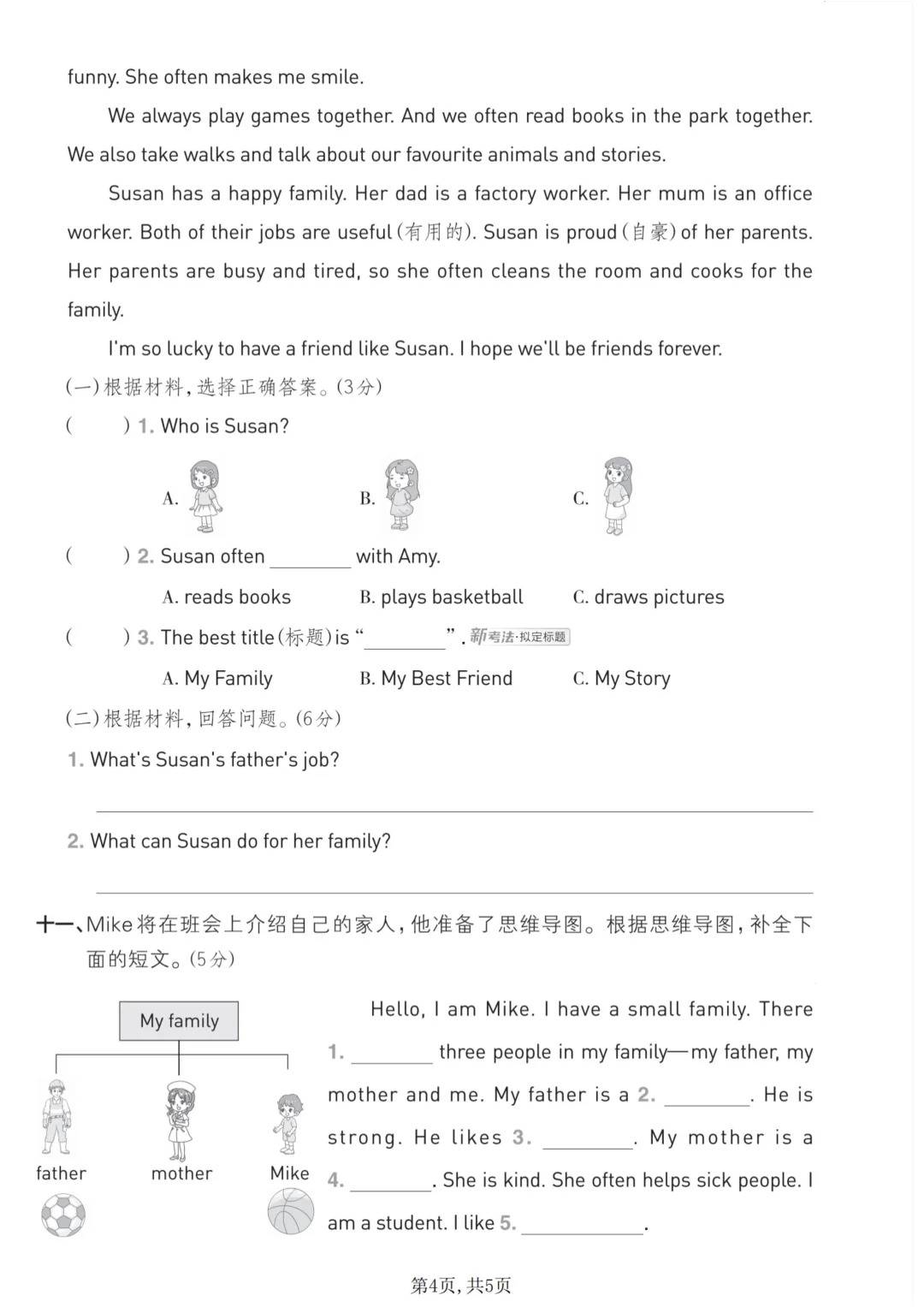 对学习有着显著的帮助意义。一方面,多样的题型设计能帮助学生系统检测英语知识与技能的掌握情况,从听力的信息捕捉到笔试的词汇、语法、阅读和写作,层层递进地排查知识漏洞,解决听力辨音不准、词汇运用错误、语法概念混淆、阅读理解浅显等问题。另一方面,试卷中丰富的语篇材料和交际情境,能提升学生的英语综合运用能力与应试技巧,让学生熟悉期中英语命题的风格与重点,培养英语思维和答题的规范性。对于四年级学生而言,这份资料是期中英语复习与提升的高效工具,不仅能针对性地强化各板块知识,还能培养良好的英语学习习惯,为后续英语素养的提升奠定坚实基础。