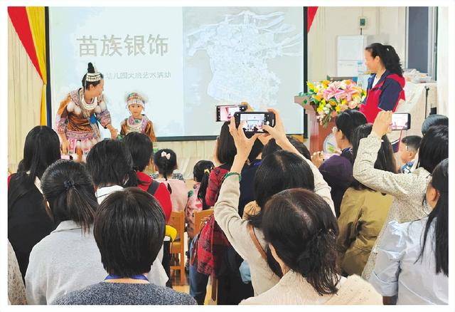 活动中,该园保教主任张婷婷、团支部书记江青青带领学员参观园所环境,让大家沉浸式感受“悦”文化与民族文化的融合。张业叶老师执教“苗族银饰”艺术活动,通过实物展示、视频讲解、手工创作,引导孩子们了解苗族银饰的纹样与文化寓意。皮雨婷老师以桂林本土非遗扎染为切入点,分享“扎染寻色记”主题活动思路。
