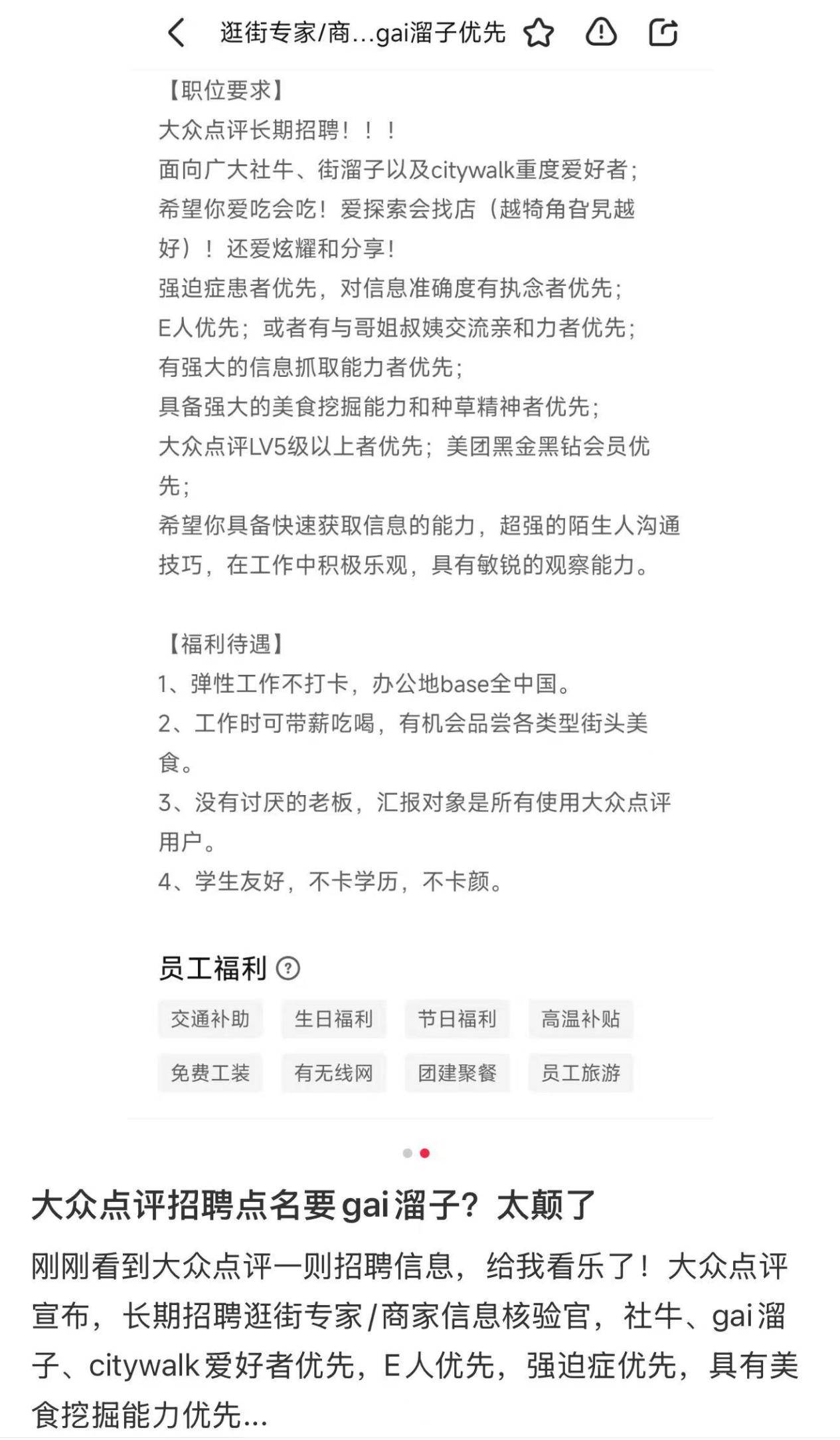 岗位要求“日常喜欢逛街探店、吃喝玩乐且善于与商家沟通”,并打出“带薪吃喝、不限学历”的吸引点,工作成果直接面向全体大众点评用户。
