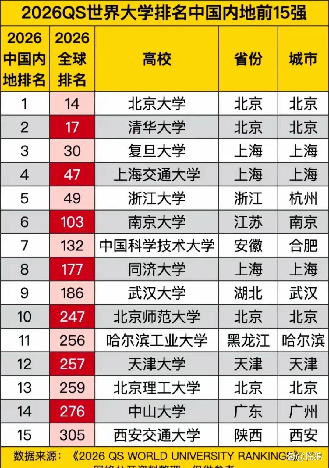 2026年QS世界大学排名新鲜出炉,中国内地高校一口气包揽全球前300中的15席,再次把“中国速度”写进世界高教版图。头把交椅仍是北大,全球第14;清华紧跟第17;复旦、上海交大、浙大分列30、47、49位,组成“华五”黄金梯队。北师大、哈工大、天大、西交等老牌学府也悉数在榜,用实力证明:中国大学不仅“大”,而且“强”。