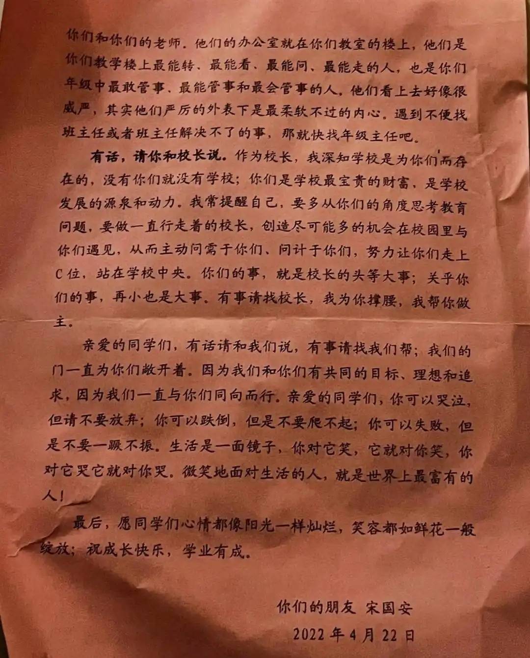 在这里,我呼吁所有的老师们,一定要重视自己的身体健康。合理安排工作时间,适当进行体育锻炼,保持良好的心态。只有这样,我们才能以更加饱满的热情和精力投入到教育事业中,为学生们的成长和未来贡献自己的力量。愿宋国安校长在天堂安息,他的教育理念和精神将永远激励着我们前行。