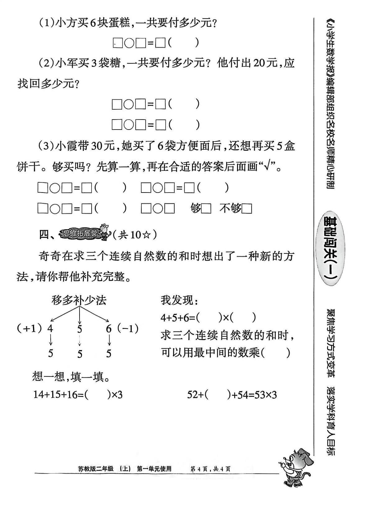 今天为大家分享:25秋二年级上册数学苏教版小数报,是对该学段数学知识的系统考查,涵盖乘法运算、乘加乘减、乘法意义、除法运算、解决问题等多个方面,从基础计算到综合应用层层递进。计算部分包含表内乘法、除法的口算,如 “6×4”“30÷5”,还有乘加乘减的混合运算,如 “4×4-9”;概念部分围绕乘法的意义展开,通过看图写乘法算式、加法改乘法、图形表示乘法等形式,让学生理解 “几个几相加用乘法” 的核心概念;应用部分结合生活场景,如摆图形用小棒数量、领球类数量、楼房住户计算、购物花费等,考查学生用乘除法解决实际问题的能力;思维拓展部分涉及连续自然数求和的规律探究,提升学生的逻辑推理能力。
