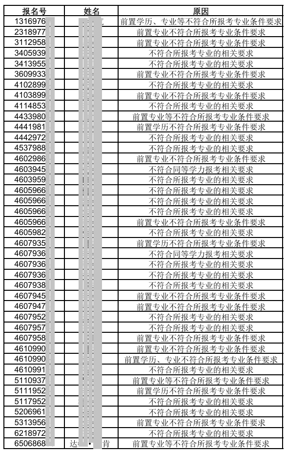 学校对网上确认结束后的考生报名信息进行审核,现将审核后不符合报考条件的考生名单进行公布,凡不按要求报名造成后续不能考试、复试或录取的,后果由考生本人承担。