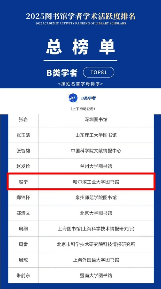 近日,由“图书馆学术评价课题组”研发的《2025图书馆学者学术活跃度排名》正式发布,列出了2020至2024年间全国图书情报领域中最具学术活跃度的学者。本次共统计有效学者3943位,上榜学者394位(前10%),并按分数区间(前1%、3%、5%、7%、10%)段分为五个等级。其中,A类40人、B类81人、C类82人、D类81人、E类110人。我校图书馆赵宁研究馆员入选B类,这也是赵宁继去年上榜B类学者后的再次入选。