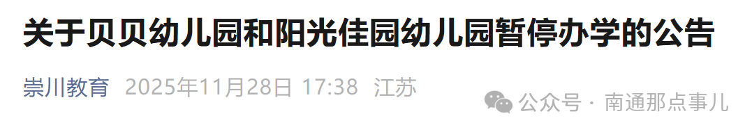 《关于贝贝幼儿园和阳光佳园幼儿园暂停办学的公告》