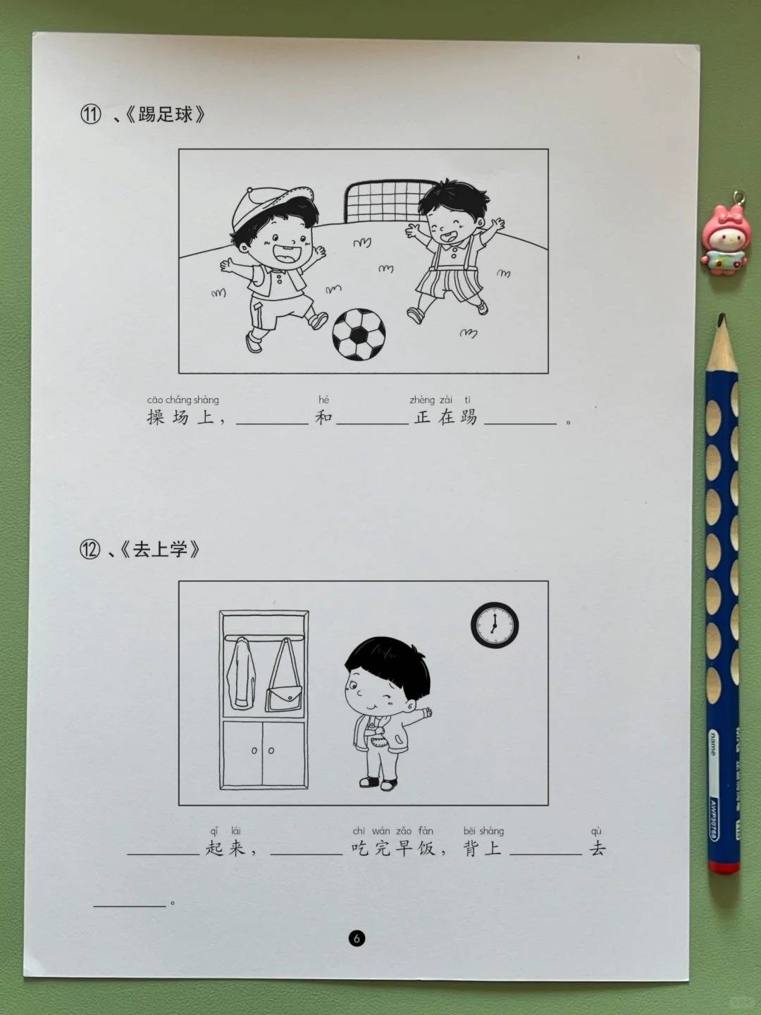 等孩子熟悉基础句式后,练习会 “逐步加细节”,帮句子慢慢变丰富。先是巩固 “谁 + 在哪 + 干啥” 的基础结构,比如写《小花狗》时,先让孩子用 “小花狗、门口、啃骨头” 写出基础句,再提示 “能不能说说小花狗的样子?”,引导孩子补充 “小花狗摇着尾巴在门口啃骨头”;接着会加入 “时间” 要素,比如写《小刺猬背果子》,先给关键词 “小刺猬、树下、背果子”,再额外提示 “加上时间,比如秋天”,让孩子写出 “秋天,小刺猬在树下背果子”;之后还会加入 “动作、表情” 等细节,比如写《小朋友放风筝》,提示 “加上小朋友的表情,比如开心地”,引导孩子写出 “小朋友在广场上开心地放风筝”,一步步帮孩子打开思路,让句子不再干巴巴。