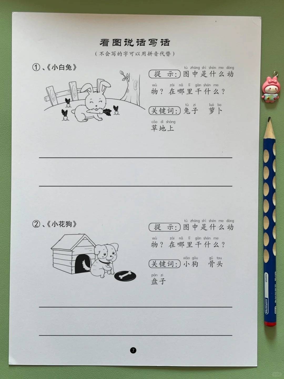 这份练习最贴心的就是 “起步超简单”,完全不给孩子压力。每道看图写话题都配了 “提示 + 关键词”,孩子不用绞尽脑汁想内容,跟着提示就能轻松写句子。比如写《小白兔》的看图题,会直接给出 “兔子、草地上、吃萝卜” 三个核心关键词,还附带简单提示:“先写谁,再写在哪,最后写在干啥”,孩子只要把这几个要素串起来,就能写出 “小白兔在草地上吃萝卜” 这样 20 字左右的基础句,轻松迈出看图写话第一步;再比如《小花猫》的题目,会提示 “关键词:小花猫、院子里、追蝴蝶”,引导孩子写出 “小花猫在院子里追蝴蝶”,帮孩子建立 “看图写话不难” 的信心。