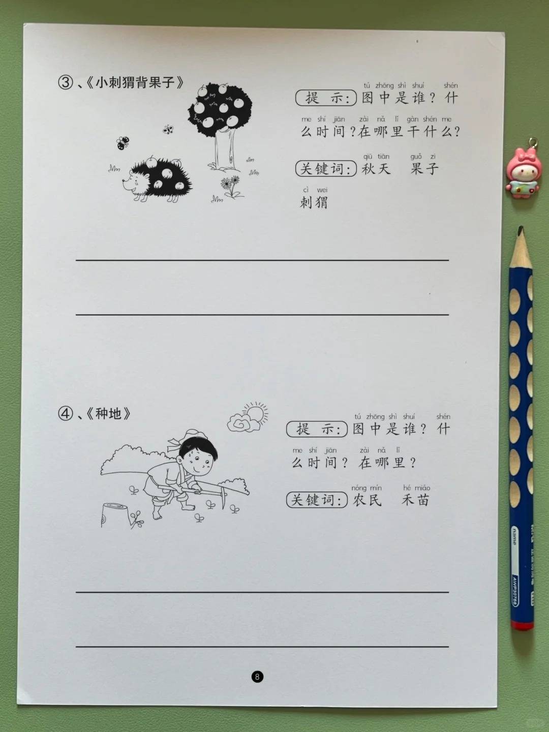 更科学的是,练习还设计了 “字数梯度练”,从 20 字短句自然过渡到 50 字小段落,帮孩子悄悄掌握写话逻辑。刚开始的题目要求写 20 字左右,比如《小鸟》只需写出 “小鸟在树上唱歌”;练几题后,字数要求慢慢提升到 30-40 字,比如《小刺猬背果子》,在 “秋天,小刺猬在树下背果子” 的基础上,提示孩子补充 “果子的样子”,写出 “秋天,小刺猬在树下背果子,果子圆圆的真可爱”;到后期,会引导孩子写 50 字左右的小段落,比如《小朋友堆雪人》,先写 “冬天,小朋友在院子里堆雪人”,再提示补充 “堆雪人的动作、雪人的样子”,最终写出 “冬天,小朋友在院子里堆雪人。他们滚雪球、插鼻子,堆出的雪人戴着红帽子真好看”。整个过程循序渐进,孩子不会觉得难,还能慢慢明白 “怎么把话写长、写具体”。