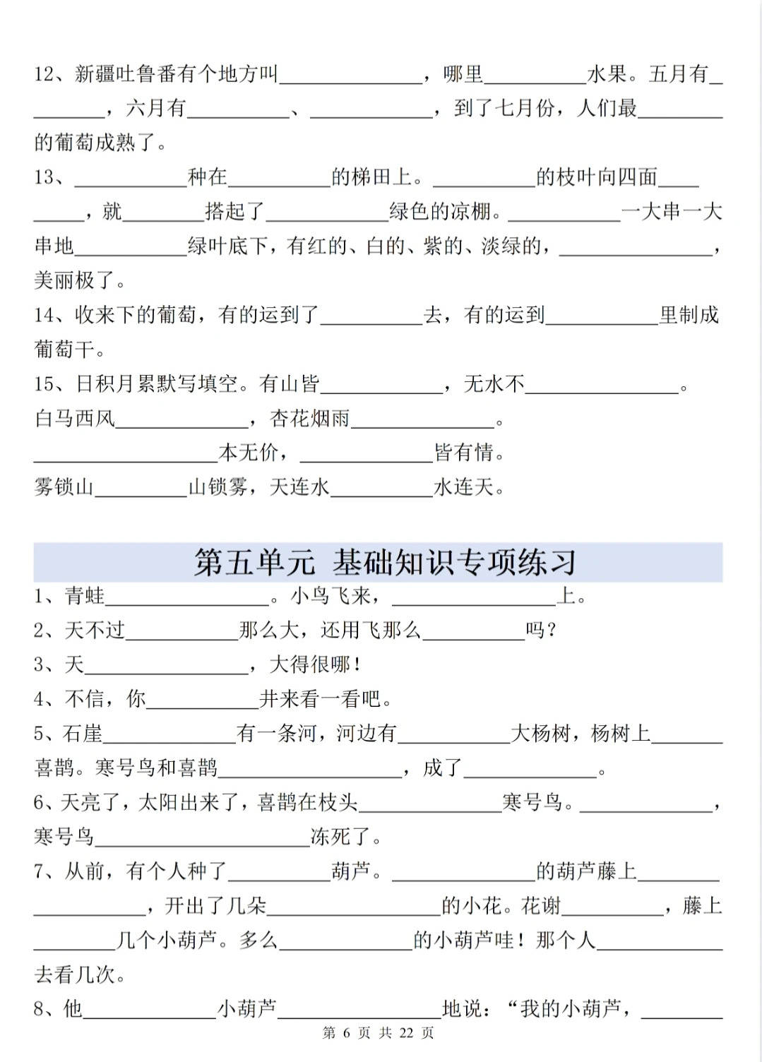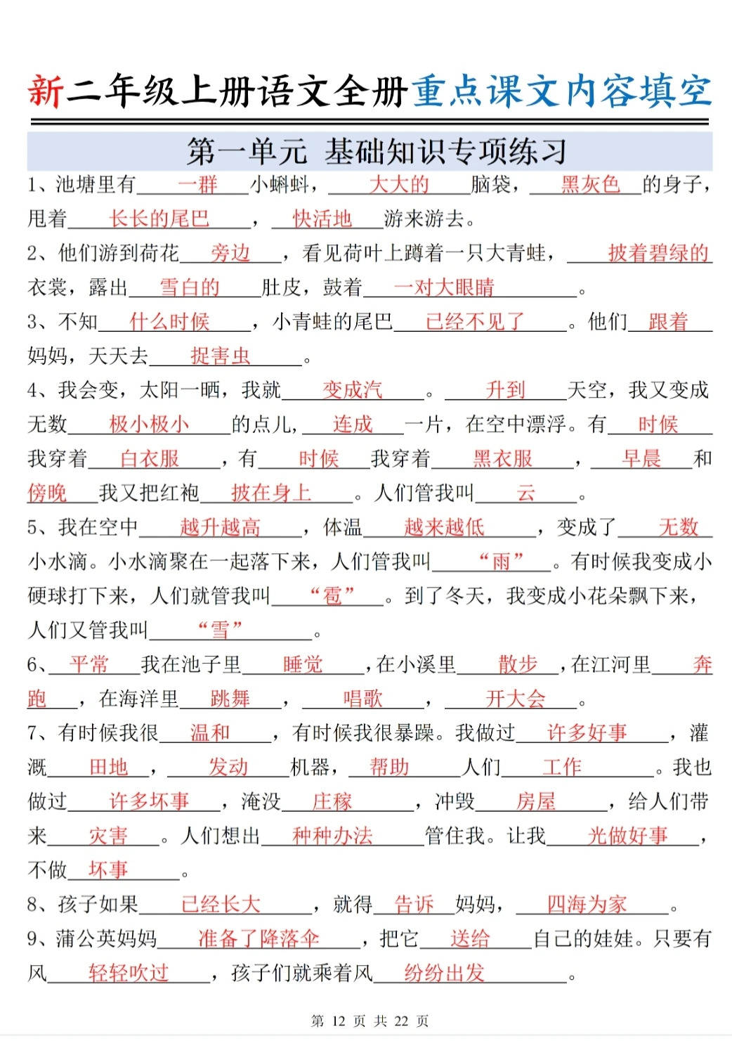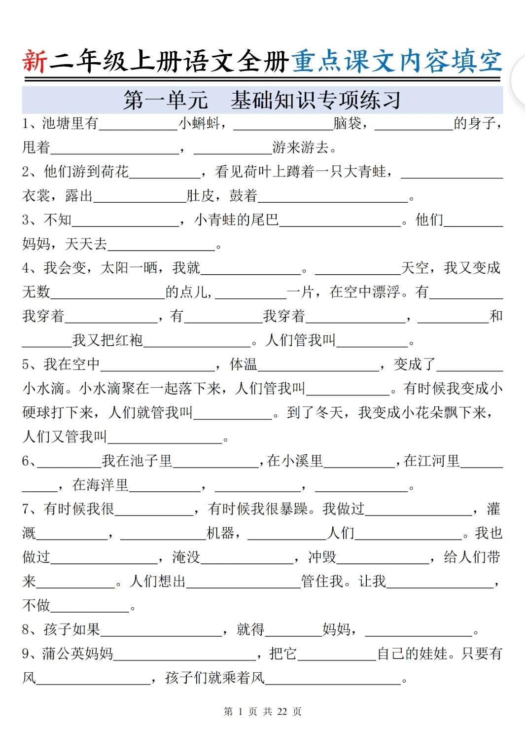 新二年级上册语文全册重点课文填空太实用了!这波是 22 页专项练习,涵盖全单元课文细节(《小蝌蚪找妈妈》《我是什么》)、古诗默写(《梅花》)、日积月累(对联 / 谚语),连 “植物妈妈传播种子的方法”“青蛙生长过程” 等课文核心内容都做成填空,从基础积累到课文理解全覆盖!