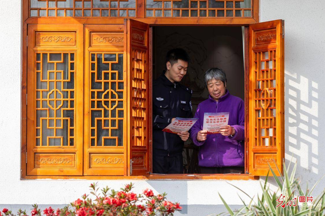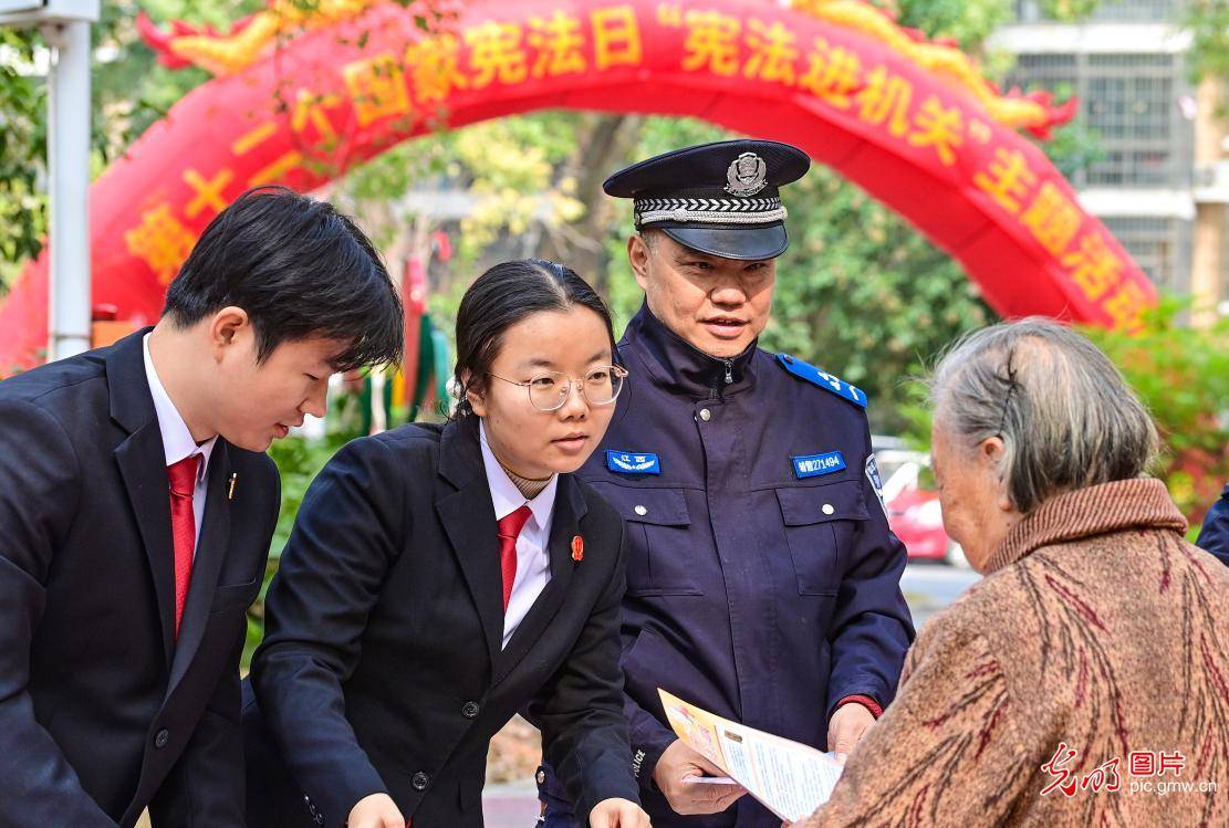 2025年12月2日,安徽省宁国市公安局会同市司法局等多部门集中开展"宪法宣传周"主题宣传活动。图为民警开展"宪法宣传周"活动。(高鹏摄/光明图片)