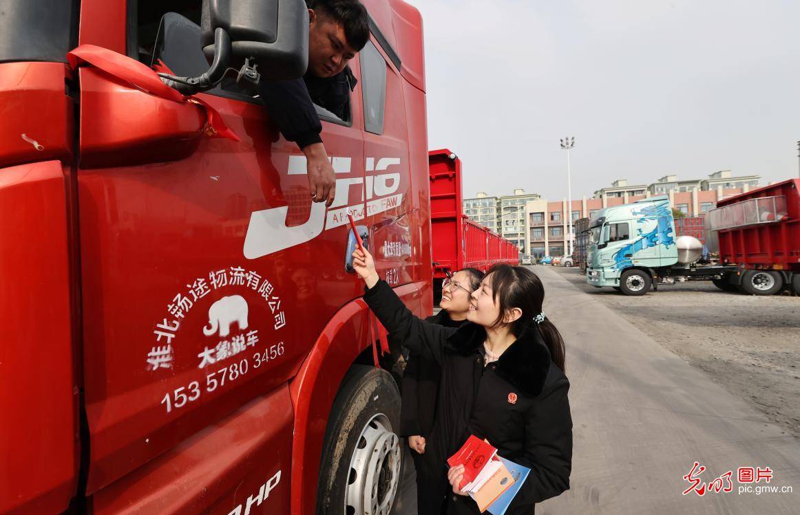 2025年12月2日,安徽省淮北市总工会联合烈山区法院组织法官走进一货运物流企业"司机之家",通过开设小课堂、案例讲解、发放读本宣传单等形式,向过往货车司机及货运行业从业人员普及宪法知识,提供法律咨询。(张锋摄/光明图片)