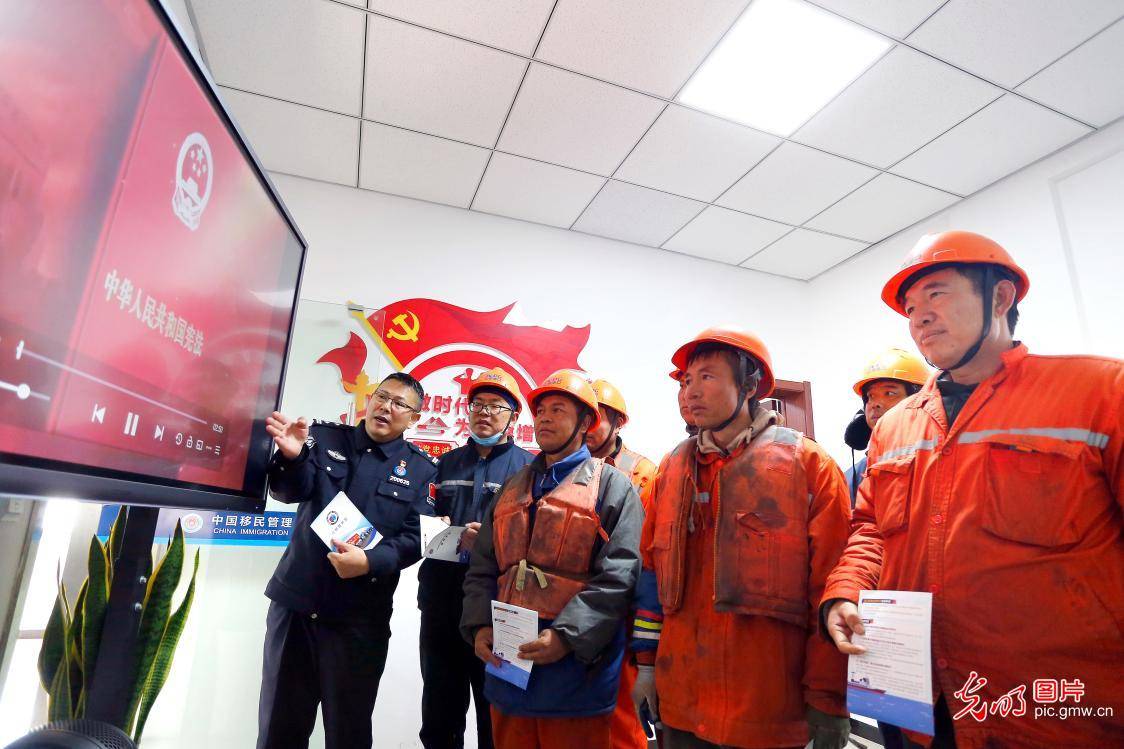 围绕优化法治化营商环境,各地精准对接企业需求开展普法。2025年12月3日,在南京港新生圩港区,南京港出入境边防检查站执勤民警正在向码头工人宣传宪法知识和出入境法律法规。(章善玉摄/光明图片)