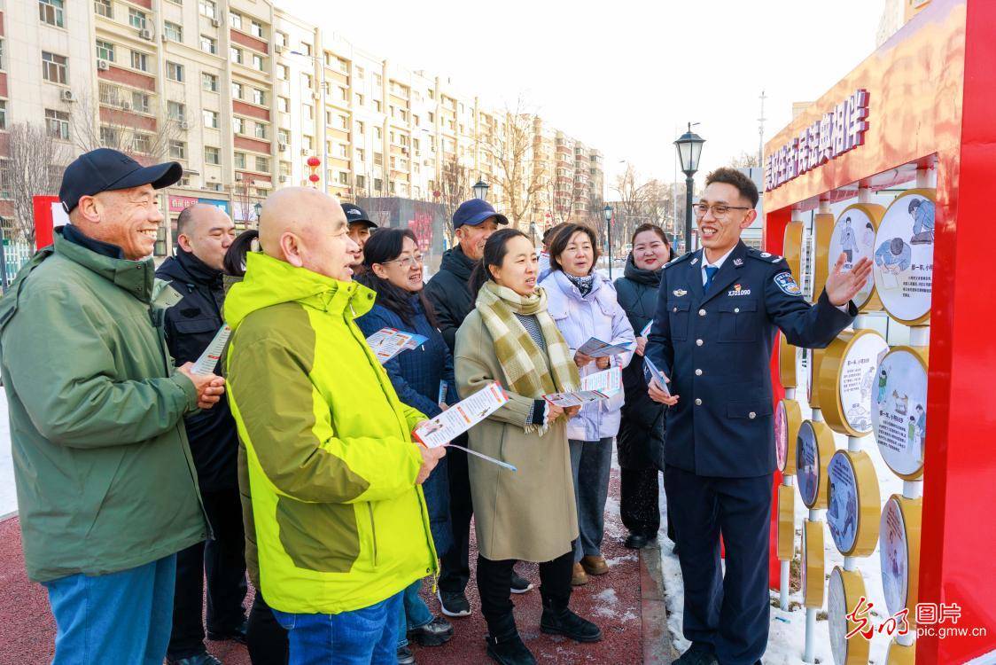 针对老年人、残疾人等特殊群体,各地开展“敲门送法”等精准服务。2025年12月2日,新疆乌鲁木齐市天山区幸福路街道天福花园社区法治小游园,幸福路司法所工作人员正在向党员群众宣讲宪法知识。(孙振嵩摄/光明图片)