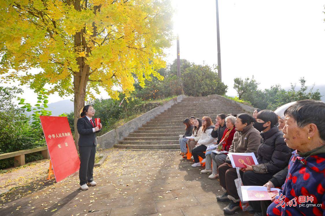 针对农村群众的法律需求,各地组建“送法小分队”,将法治课堂搬到乡村党群服务中心、种植基地甚至村民家门口。2025年11月26日,重庆市开州区人民法院干警走进开州区长沙镇长沙村,开展"宪法宣传进乡村"活动。干警用通俗易懂的乡音俚语向乡亲们宣传讲解宪法知识。(边俊铭摄/光明图片)
