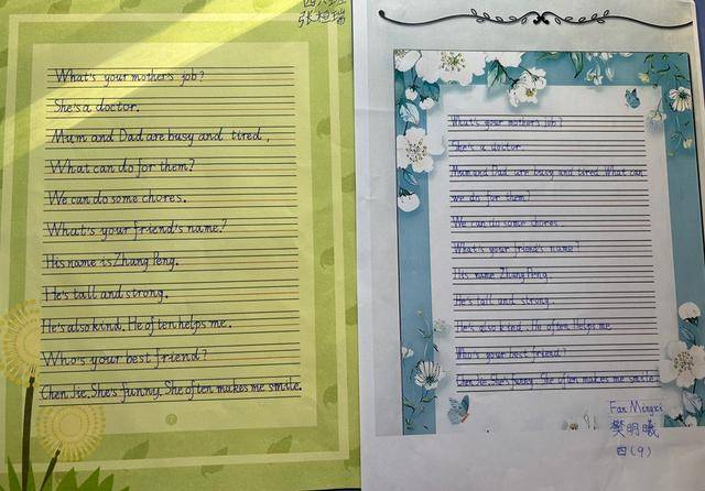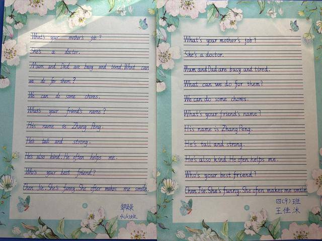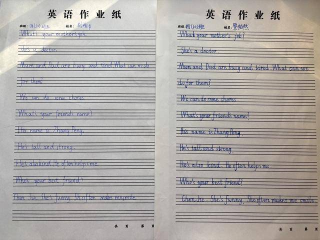 学生们严格按照要求,在纸页上工整注明班级与姓名,在规定时间内完成了专属书写任务。每一份作品都凝聚着他们的努力与心血,展现出四年级学子扎实的书写功底和一丝不苟的学习态度。一批书写规范、卷面整洁、富有美感的优秀作品脱颖而出。这些作品不仅字母占格精准、笔顺无误,更在单词间距、句子标点等细节上展现出极高的规范性,成为同学们学习的榜样。