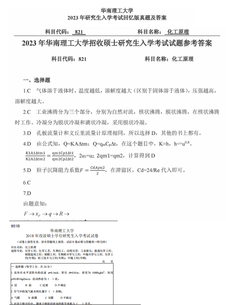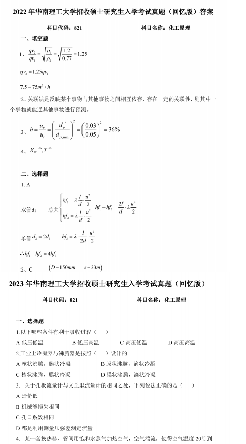2000-2023年华南理工大学821化工原理考研真题试卷与答案