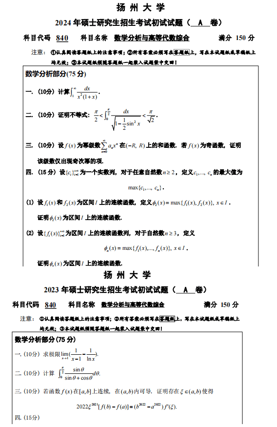 2018-2024年扬州大学840数学分析与高等代数综合考研真题参考答案【22-23手写版,25没答案】