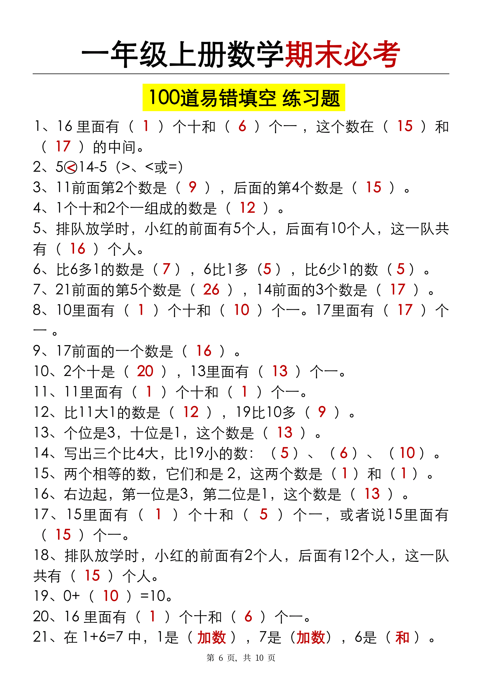 宝妈必存!🔥刚整理出一年级上册数学期末必考的100道填空易错题,全是娃最容易踩坑的题目💯