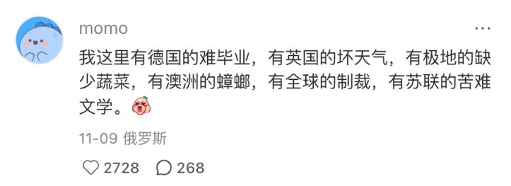 俄罗斯能够产出伟大的苦难文学作品是有原因的。俄罗斯不仅有德国的难毕业,英国的坏天气,有极地的缺少蔬菜,有澳洲的蟑螂,有全球的制裁,有苏联的苦难文学。