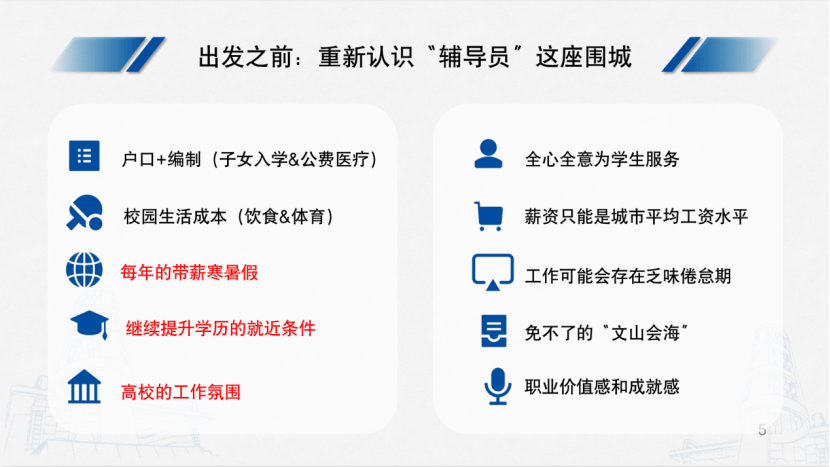 王赫老师希望同学们理性看待辅导员岗位,从多维度解析了其“双面性”:既有户口编制、带薪寒暑假这些让人安心的保障,也有高校氛围、学历提升便利这些暖心的小优势;当然也会聊到它的实际日常 —— 比如薪资处于城市平均水平、偶尔会遇到工作倦怠期,还有不少事务性的忙碌压力等现实挑战。