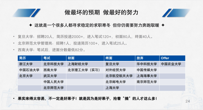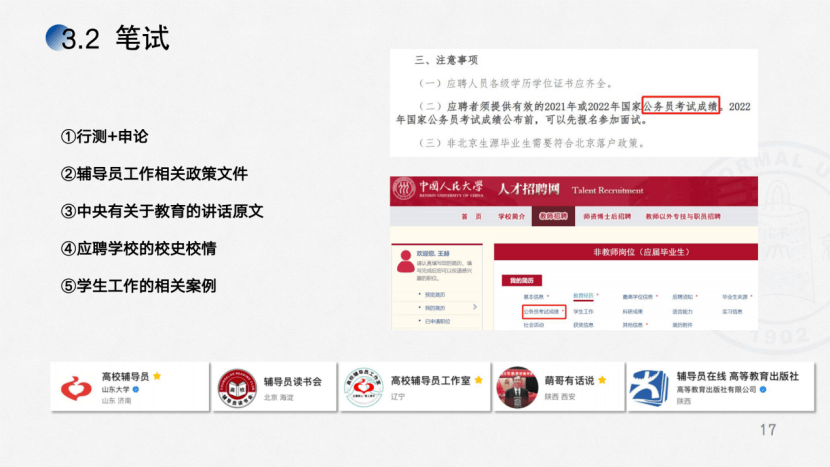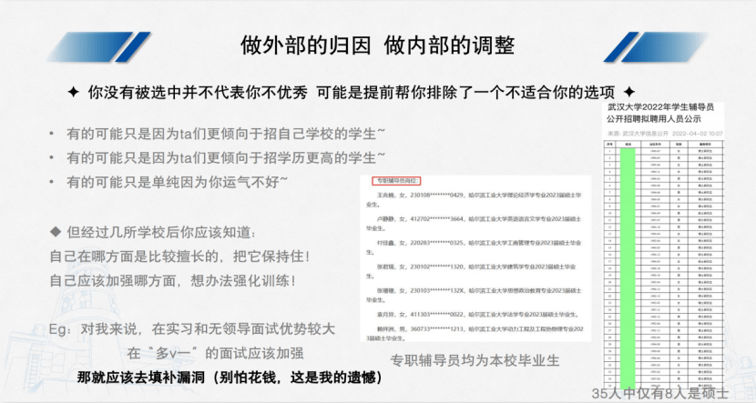 本次讲座主讲嘉宾为中国农业大学植物保护学院专职辅导员、北师大心理学部2022届硕士毕业生王赫老师。老师为我们分析了辅导员的优劣势、备考要点和真实工作情况,帮助同学们进一步明确方向,提高备考效率。干货内容已经整理好,同学速速来get吧!