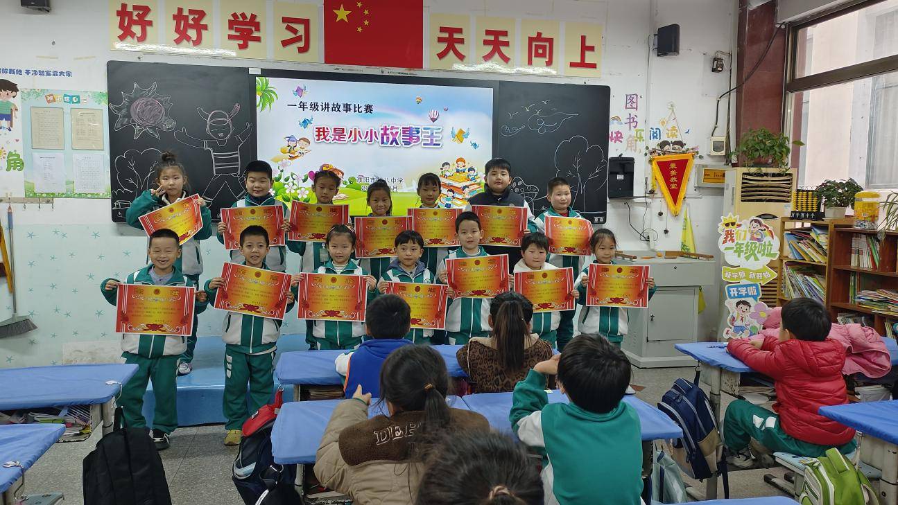 年级决赛现场氛围热烈而温馨。教室背景屏清晰展示“我是小小故事王”主题,搭配童趣插画,与班级阅读角、精心绘制的黑板报相映成趣,洋溢着浓厚的校园文化气息。小选手们精神饱满地登上讲台,绘声绘色的演绎让现场观众沉浸其中。决赛结束后,获奖学生手持奖状合影留念,一张张笑脸定格成校园里最纯真的风景。