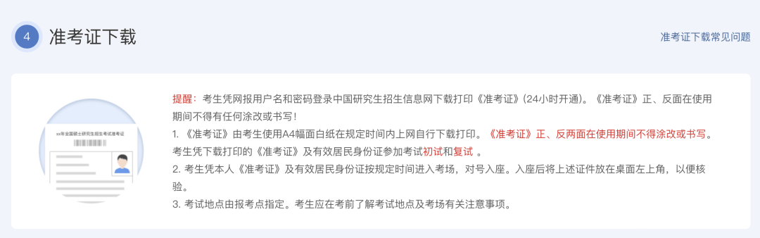 据研招网通知,考生可在考前十天左右(预计12月10日),凭网上报名的用户名和密码登录“研招网”自行下载打印《准考证》。《准考证》使用A4幅面白纸打印,正、反两面在使用期间不得涂改或书写。考生凭下载打印的《准考证》及有效居民身份证参加初试和复试。
