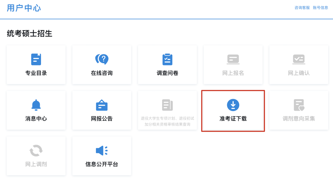 点击研招网右上角「用户中心」,进入后选择「准考证下载」。