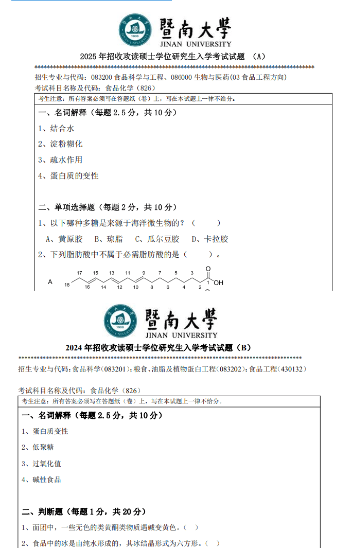 2025年暨南大学826食品化学考研真题试卷【无答案】