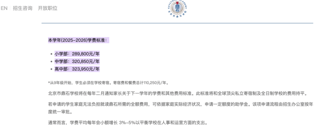 北京鼎石学校在官网中给出的理由是,一般学费每年都会小额增长3%-5%,以此来平衡学校在人事和运营方面的支出。这个说法是很多学校的统一口径。