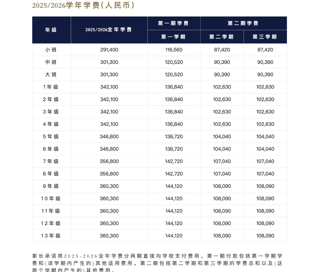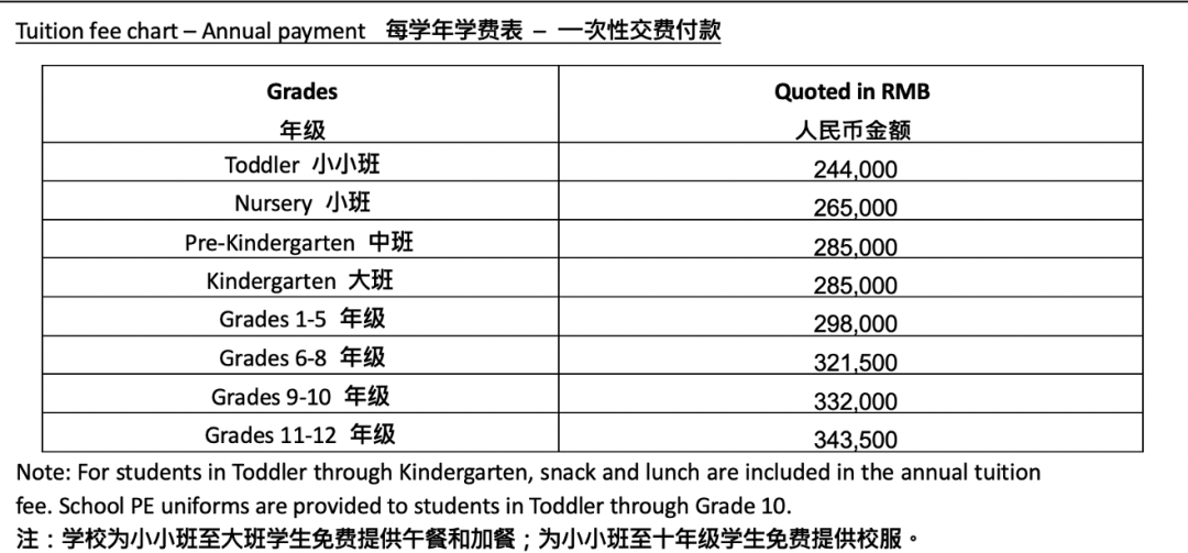 收费最低的小小班今年学费不变,依然是24.4万元,小、中大班、1到5年级都上涨了六七千元,6年级到12年级都上调了1万元左右。