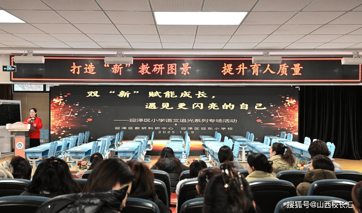 为推进新修订教材研读与教学实践的深度融合,促进各校业务领导专业发展,推动“追光行动”向更深层次迈进,为区域小学语文教育高质量发展搭建研思共进的平台,更好地为一线教师把握教材精髓、创新教学方法提供学习交流的契机,2025年12月9日,太原市迎泽区小学语文“追光行动”系列专场活动之“双‘新’赋能成长——遇见更闪亮的自己”在迎泽区迎东小学顺利召开。全区业务领导、区级导师团全体师徒,小语中心组骨干老师们欢聚一堂,共赴这场以研促教的追光之约。