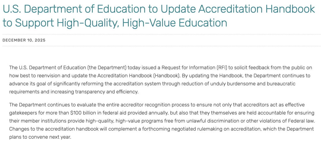 美国教育部今日发布重磅公告,宣布将全面启动对《认证手册》(Accreditation Handbook)的更新工作,并正式向公众开放意见征询。官方表示,此举旨在精简当前过于繁琐的认证流程,减轻高等教育机构面临的“不必要的官僚负担”。然而,新版手册也将强化认证机构作为联邦助学金“看门人”的核心职能,要求其在评估高校是否有资格获得每年逾1000亿美元的联邦资金时,必须更严格地审查教育质量及反歧视政策。这被视为政府试图通过行政手段重塑高等教育监管生态的重要一步。